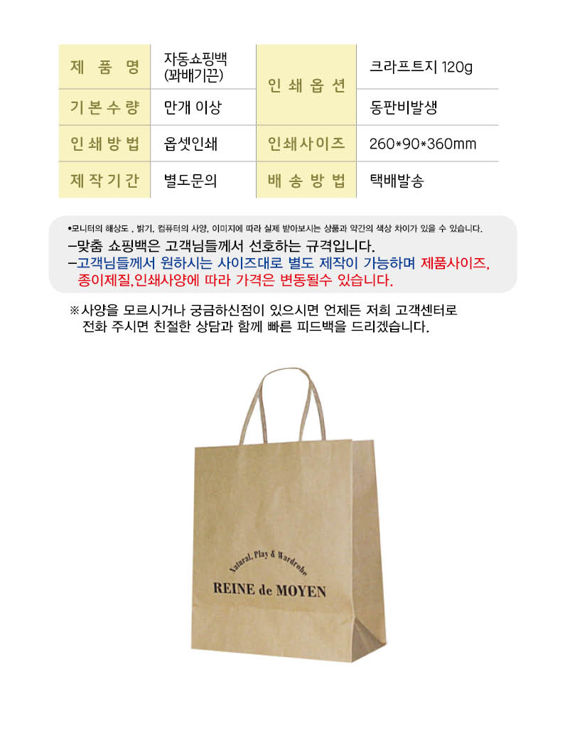 •크라프트지 120g •기본수량 10,000개 이상 •Size : 260x90x360 mm •동판비 별도